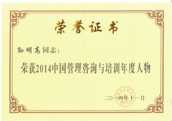 此次,孙明高董事长获此荣誉,既对其在2014年管理咨询与培训行业的贡献及成就给予了高度认可,又激励孙明高董事长为进一步促进我国管理咨询与培训行业发展,推动我国经济发展新常态下企业的转型升级和改革发展做出更多贡献。