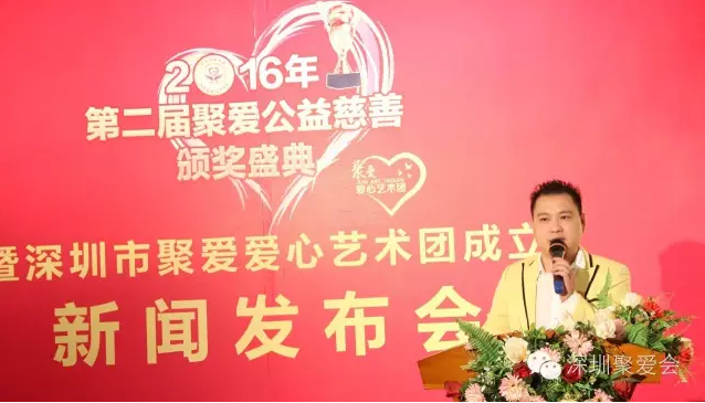 2016年10月30日下午,在世外桃源创意园举行了“深圳市第二届聚爱公益慈善颁奖盛典”暨”深圳市聚爱爱心艺术团成立”新闻发布会。此次颁奖盛典将于12月31日在广电集团隆重举行,冠名招商活动同时火热启动。此次活动是由深圳市聚爱爱心促进会发起的,得到了深圳市民政局、深圳市关爱办、深圳市义工联深圳广电公益基金会、深圳市慈善会.德义基金、中国《社会与公益》杂志社等各界爱心机构的大力支持。此次盛典是为了更好地促进、发展、鼓励一直以来坚持在深圳爱心事业上的杰出爱心人士、爱心机构及爱心企业。深圳市天成投资集团副总裁汪润田先生应邀参加此次新闻发布会。
