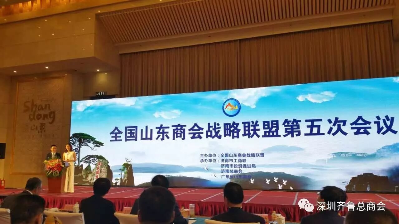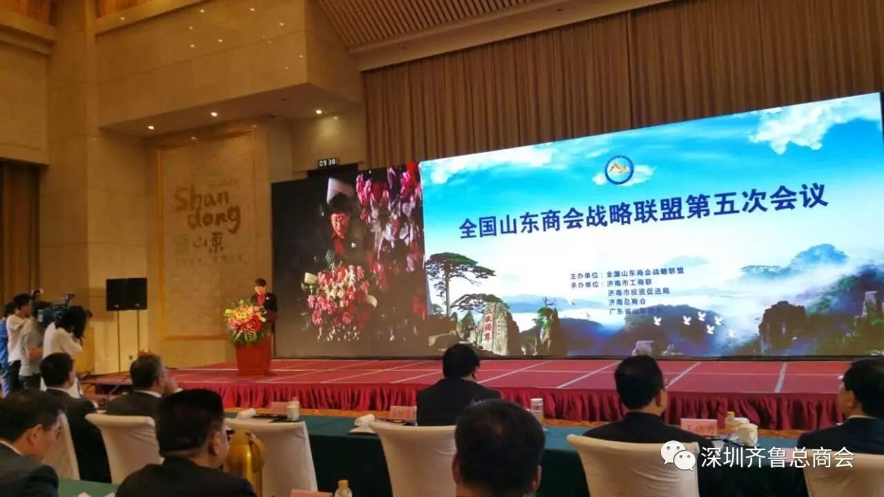 2017年6月3日上午,全国山东商会战略联盟第五次会议在济南市山东大厦金色大厅召开。本次活动得到了山东省委省政府、济南市委市政府的大力支持。出席本次会议的领导有全国工商联副主席王志雄,山东省副省长、省工商联主席王随莲、济南市委副书记、市长王忠林,市委常委、统战部部长王拥华,副市长王宏志,市政协副主席李继民,市政府秘书长毛华铭等。全国30余家山东商会会长和秘书长参加了此次会议。全国山东商会战略联盟副主席、深圳市齐鲁总商会会长、深圳市天成投资集团董事长孙明高先生、深圳市齐鲁总商会秘书长杨立振先生应邀参加此次活动。