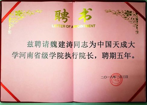 中牟学院隶属中国天成大学河南省级学院管理,为便于中牟学院和河南省级学院资源共享,合作发展,魏建涛院长同时兼任中国天成大学河南省级学院执行院长。