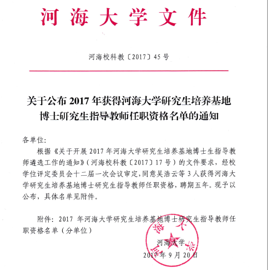 孙明高博士出任河海大学研究生培养基地博士研究生导师