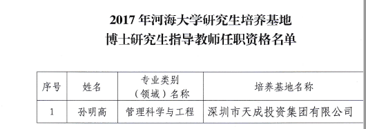 为充分发挥校、企双方优势,加强研究生联合培养基地建设,提升研究生实践能力和创新能力,促使研究生教育加快适应建设创新型国家战略的需要。经河海大学学位评定委员会十二届一次会议审定,正式聘任孙明高博士为河海大学研究生培养基地“管理科学与工程”专业博士研究生导师,聘期五年,同时设立深圳市天成投资集团为河海大学博士研究生培养基地。
