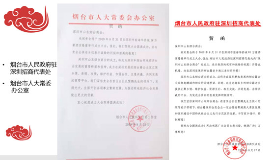欣闻深圳市山东烟台商会成立大会召开,政府、产业机构、学校、科研机构、金融机构、行业协会、媒体等社会各界及海内外兄弟商会纷纷发来贺函贺电表示祝贺,发来贺函贺电的有:中共烟台市市委、市政府、统战部、市人大、市政协,市工商联以及烟台市各县市区统战部、工商联;来自全国32个省市自治区山东商会和海外山东商会,以及属下地市的各级山东商会;广东省山东商会各分会;广东省企业管理咨询协会、深圳市外商投资企业协会、深圳市高新技术产业促进会等多家行业协会。