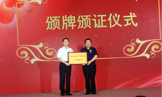 第一项,中共烟台市委常委、统一战线工作部部长金志海为广东省山东烟台商会授予“山东省烟台市‘双招双引’广东服务站”牌匾,由孙明高会长上台接受牌匾。