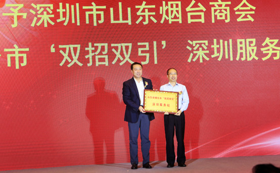 第二项,烟台市工商联党组副书记、副主席王春雷为深圳市山东烟台商会授予“山东省烟台市‘双招双引’深圳服务站”牌匾,孔繁鹏会长接受牌匾。