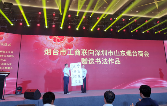 烟台市工商联副调研员王大勇代表烟台市工商联向深圳市山东烟台商会赠送书法作品。