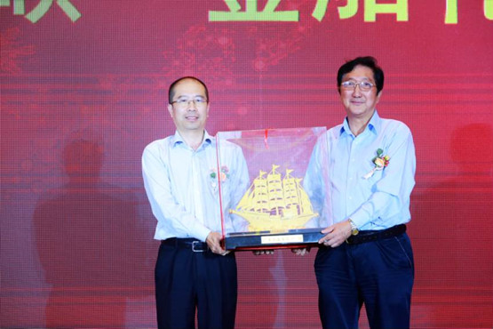 广东省山东商会李建国监事长代表广东省山东商会向深圳市山东烟台商会赠送“一帆风顺”金船礼品。
