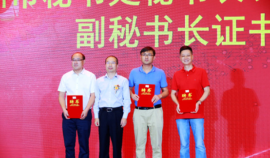 第九项,深圳市山东烟台商会孔繁鹏会长为秘书处秘书长车雪涛、执行秘书长徐涛、副秘书长周星光、孙勇涛颁发证书。