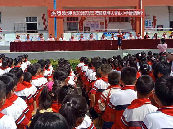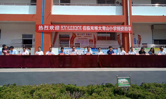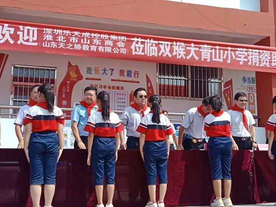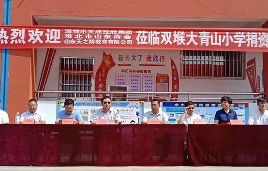 2019年9月5日上午,由深圳市乐天成控股集团、淮北市山东商会、山东天之娇教育有限公司联合举办的捐资助学活动,在临沂市沂南县双堠镇大青山小学举行。临沂市工商联党组成员、副主席许金涛,沂南县工商联党组书记段可富,沂南县教体局党组书记、局长李道宽,山东省委组织部任职仲山村支部书记张锦光,沂南县统战部部长聂成芳,沂南县双堠镇党委书记刘树昌,沂南县双堠镇党委副书记、镇长左潇河,沂南县双堠镇中心小学校长马清德,以及大青山小学师生出席了此次活动。