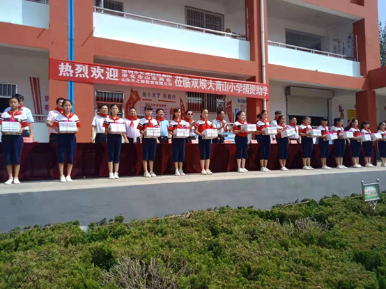 为将大青山小学建成一所“平安学校+智慧学校”,建成一所教育信息化示范小学,此次捐资助学活动,在山东省鲁商联盟会孙明高常务副会长的带领下,共捐资107万元。其中,深圳市乐天成控股集团捐赠了326台平板电脑,价值56万元。活动现场,学生代表上台领取了捐赠的平板电脑。