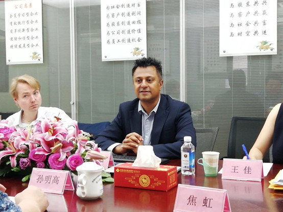 8月15日,英国搜财公司JatinOndhia CEO、Igor Gorbatsevich、王佳一行莅临深圳市乐天成控股集团考察交流,山东省鲁商联盟常务副会长、广东省山东商会常务副会长、广东省山东烟台商会会长、深圳市齐鲁总商会会长、深圳市乐天成控股集团董事长孙明高和深圳市金控集团总经理许德学、副总经理焦虹在商会会议室热情接待了JatinOndhia CEO一行,双方围绕英国搜财公司项目投资工作展开了座谈交流。