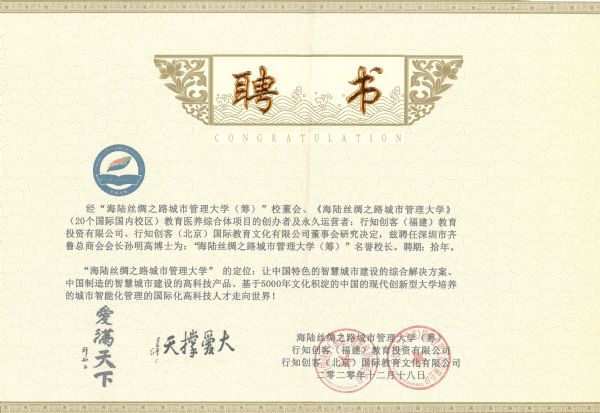在经济全球化时代,人才已成为决定一国参与国际竞争成败的关键因素,为培养具有国际视野、具有创新思维、具有高尚的道德情操的国际化智慧城市创新管理人才,行知创客(福建)教育投资有限公司适时筹划成立海陆丝绸之路城市管理大学。鉴于孙明高董事长在教育、培训、科研、智库等领域的影响力,以及在社会发展和经济发展方面做出的突出贡献,近日,海陆丝绸之路城市管理大学(筹)特聘请孙明高董事长为名誉校长,共同推进海陆丝绸之路城市管理大学的成立事宜,共谋发展共创蓝图。