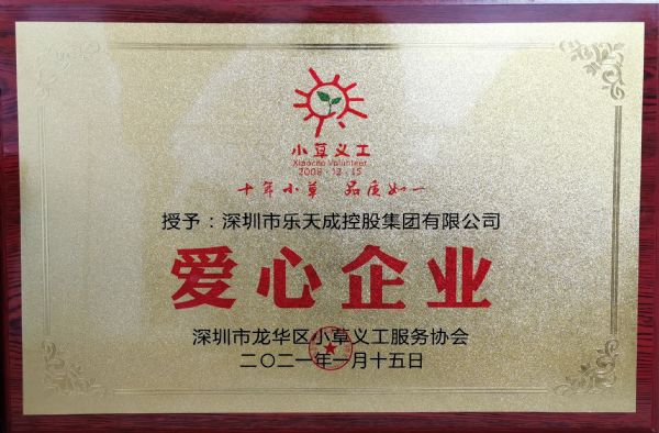 鉴于深圳市乐天成控股集团(简称“集团”)长期以来对爱心公益事业的无私贡献,以及对小草义工服务工作的支持,在2021年1月17日下午举办的深圳市龙华区小草义工服务协会成立十二周年庆典上,深圳市龙华区小草义工服务协会授予乐天成集团“爱心企业”荣誉称号。