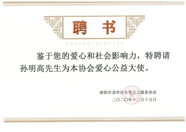 鉴于孙明高董事长在公益事业的无私奉献和社会影响力,以及多年来对深圳市龙华区小草义工服务协会给予的关心和支持,2021年1月17日,在小草义工服务协会成立十二周年表彰活动上,广东省政协原秘书长琚立铭先生为孙明高董事长亲自颁发了“爱心公益大使”荣誉证书。