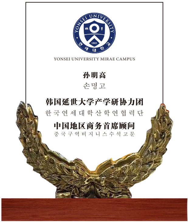 鉴于孙明高董事长在科研、教育培训等领域的影响力,以及在社会发展和经济发展方面做出的突出贡献。近日,韩国延世大学产学研协力团特聘孙明高董事长为中国地区商务首席顾问,兼任韩国延世大学产学研华南地区总部总干事长。