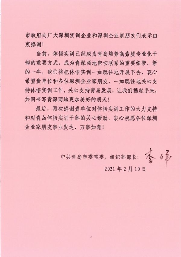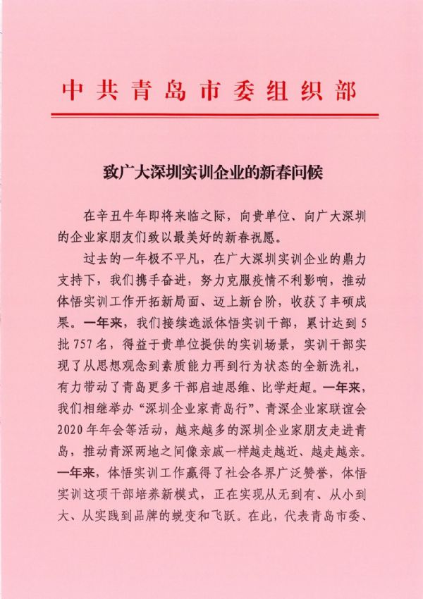 在辛丑牛年即将来临之际,中共青岛市委组织部向我单位、向广大深圳实训企业、向广大深圳的企业家朋友们致以最美好的新春祝愿。原文如下:
