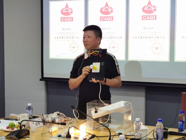 广东中科电工科技有限公司董事长林世峰现场演示了自主研发生产的安全插座的防水、智能断电性能,直观地让与会人员对于安全插座有了全新的认识。