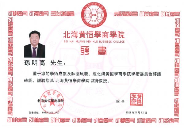 鉴于孙明高董事长是集政产学研金智文会于一身的复合型专家、学者、企业家、投资银行家和独立经济学家。近日,经北海黄恒学商学院学术委员会评议确认,诚聘孙明高董事长为北海黄恒学商学院终身教授。