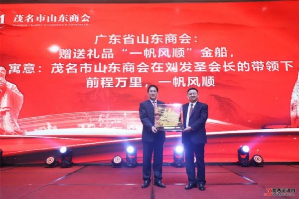 周慎坤秘书长代表广东省山东商会向茂名市山东商会赠送“一帆风顺”金船礼品。寓意:茂名市山东商会在刘发圣会长的带领下,前程万里,一帆风顺!