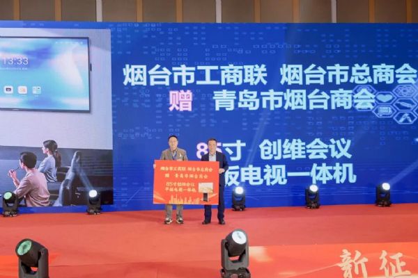 浓浓乡情在年会上温暖流淌。烟台市工商联、烟台市总商会特向商会赠送一台85英寸会议平板电视一体机。在隆重的赠礼仪式上,胡卫宁书记将这份象征智慧赋能与高效协同的礼物交到修学栋会长手中,体现了家乡对在外游子的深切关怀与支持。