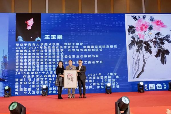 商会的文化氛围同样浓厚。青岛市烟商书画院副院长王玉娟和孙方岩将精心创作的画作《国色》赠予商会。这幅寓意富贵吉祥、事业繁荣的作品,不仅展现了烟商群体的艺术涵养,也以笔墨丹青传递了对商会未来的美好祝愿。