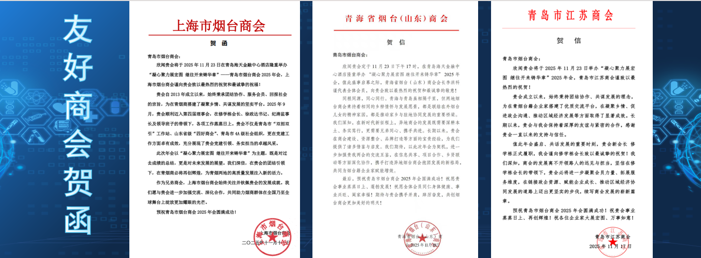 年会更收到了来自上海市烟台商会、青海省烟台(山东)商会、青岛市江苏商会等全国多地友好商会的贺信与贺礼。一份份贺函、一幅幅墨宝,承载着跨越山河的情谊,彰显了青岛市烟台商会在全国商协会网络中的广泛影响与深厚人脉。