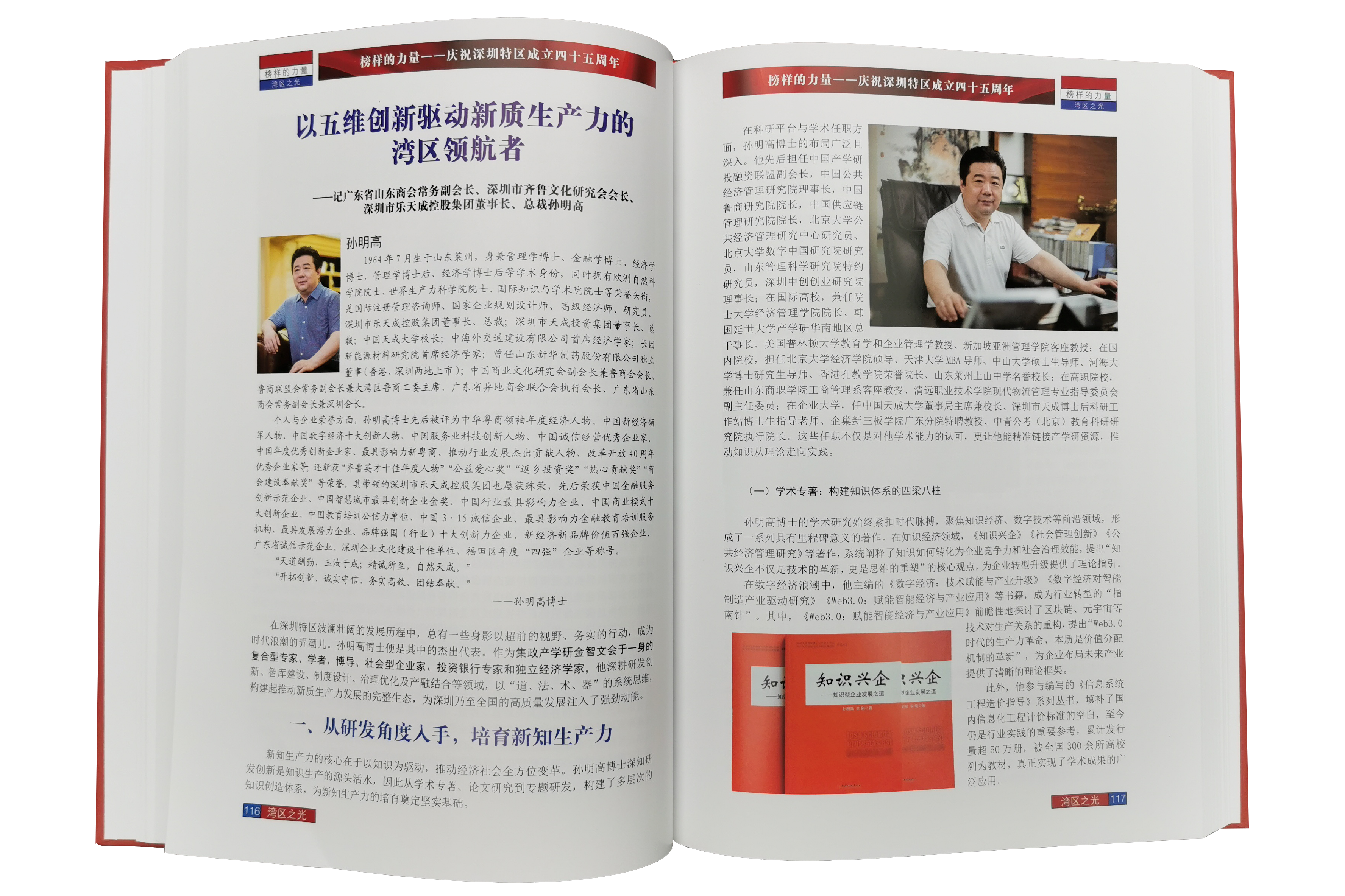 在深圳经济特区建立45周年之际,由粤港澳大湾区各界精英奋斗历程汇聚而成的大型历史文献《湾区之光》正式面世。其中,鲁商联盟会常务副会长兼大湾区鲁商工委主席、广东省山东商会常务副会长兼深圳会长、广东省异地商会联合会执行会长、深圳市齐鲁文化研究会会长、深圳市乐天成控股集团董事长孙明高的深度专访《以五维创新驱动新质生产力的湾区领航者》成为全书亮点篇章之一,生动再现了一位学者型企业家如何以系统性创新思维,为推动湾区高质量发展注入智慧动能。